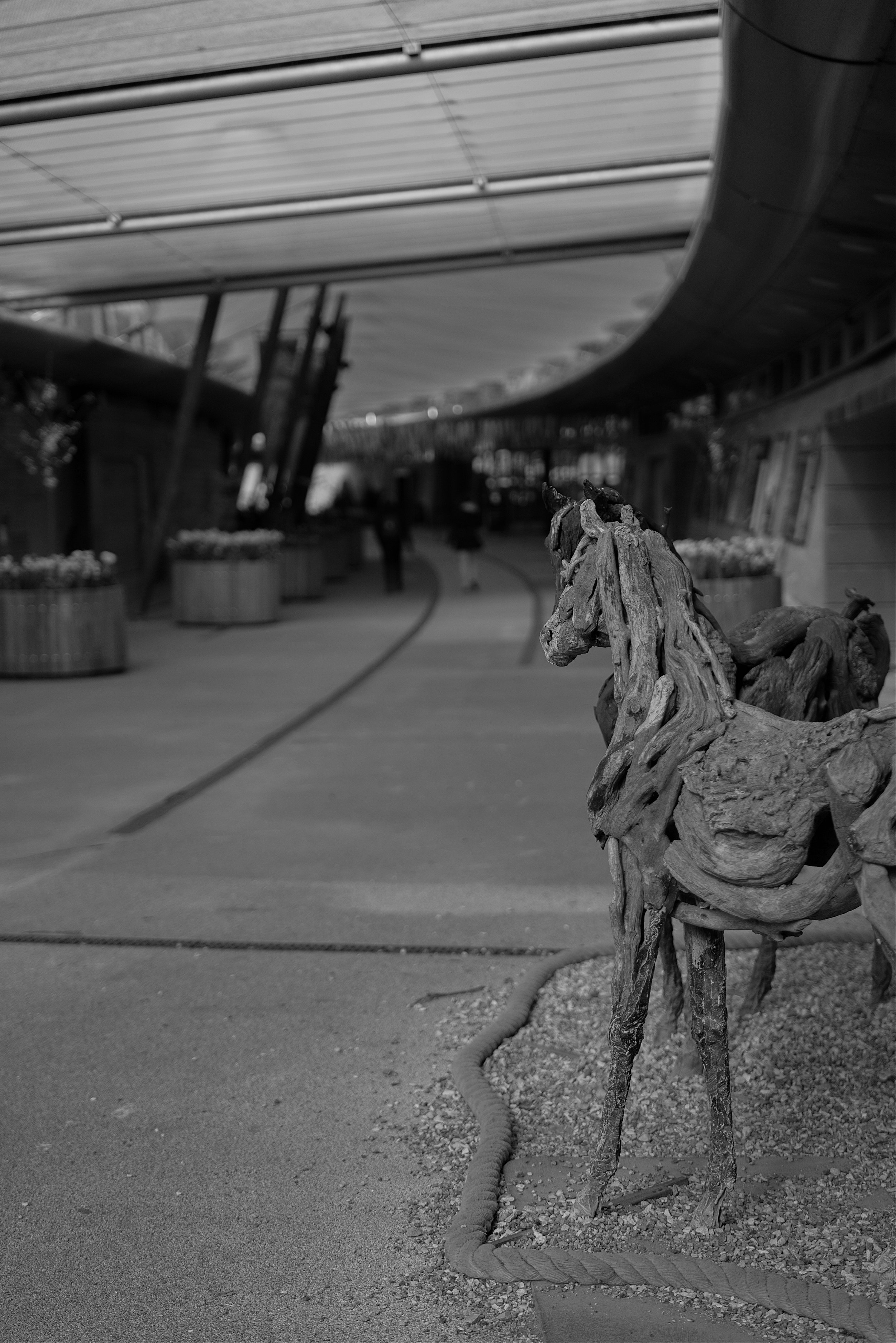Driftwood horse sculpture by Heather Jansch guards the entrance.